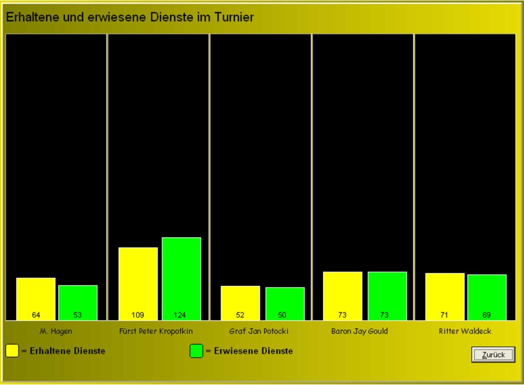 In unserer Software wird im Königsturnier das alltägliche Geben und Nehmen in unserer Welt exemplarisch abgebildet; es geht schlicht um das Gewähren und Verweigern von Diensten und Gefälligkeiten in einer egoistisch geprägten Welt. Wer dies am besten kann, erhält die Hand der Kronprinzessin Salome. Fünf Bewerber, darunter Sie, treffen aufeinander. Zug für Zug: Gewähren oder Verweigern. Spielerisch können Sie hier den komplexen Zusammenhängen beim Geben und Nehmen nachgehen.